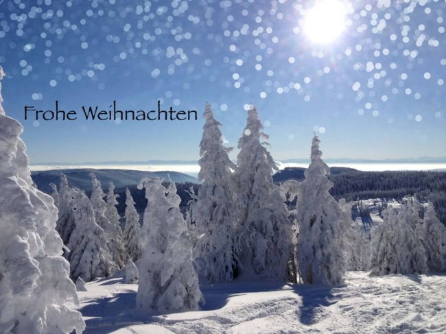 Die Weihnachtskarte 2017 zeigt eine verschneite Winterlandschaft mit sonnenbeschienenen Tannen ❄️☀️