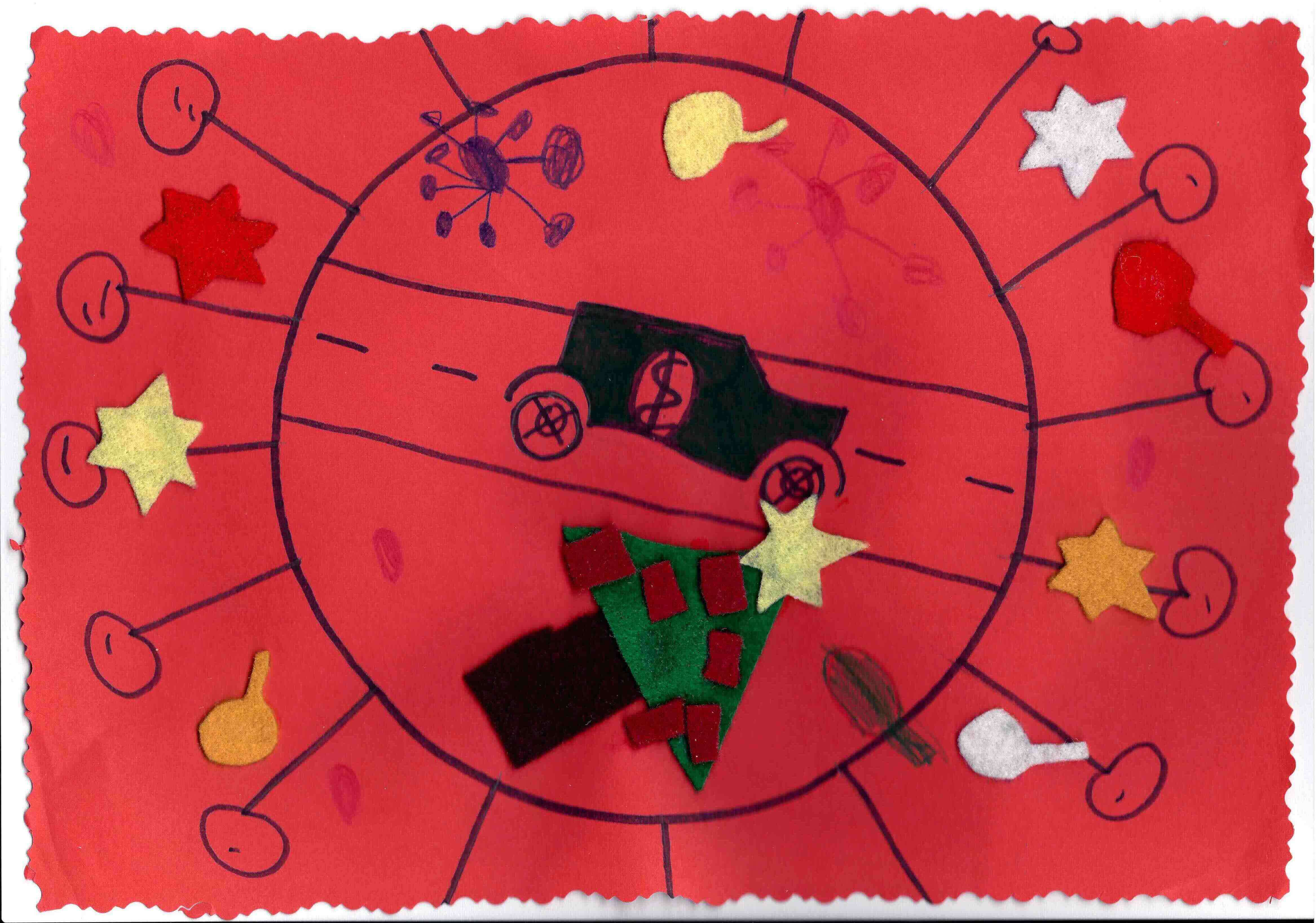 Zu sehen sind ein Coronavirus, ein Weihnachtsbaum und eine Ambulanz – kindlich, ehrlich und ausdrucksstark dargestellt.