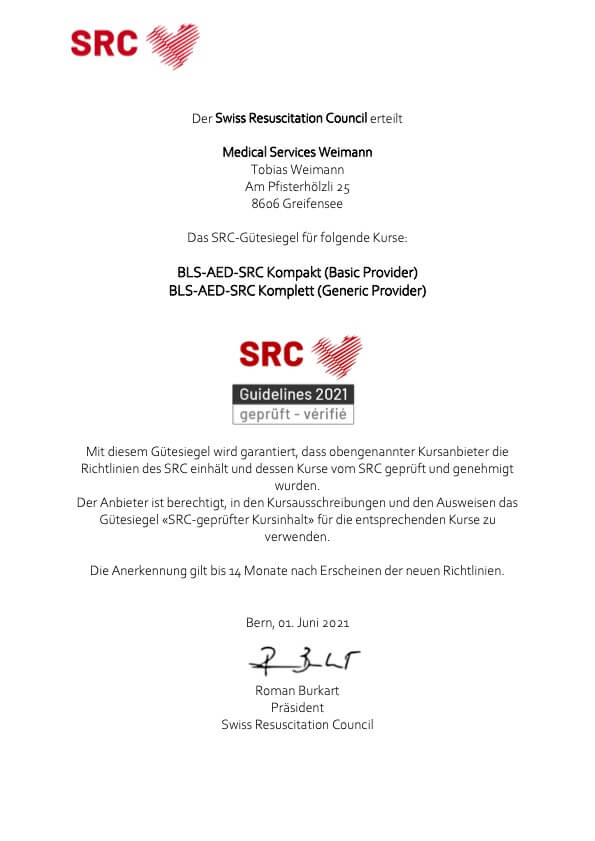 Unsere BLS-AED-SRC-Komplett - und -Kompakt-Kurse sind nach den Kursrichtlinien 2021 vom Swiss Resuscitation Council (SRC) als Präsenzkurse und als Blended Learning zertifiziert.
